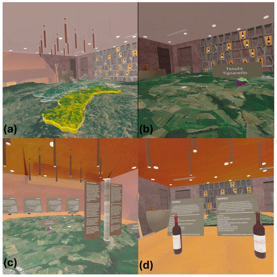 Sprint 2 focused on creating an interactive 3D scene of the “Saletta Sospesa” tasting room within the “Antinori nel Chianti Classico” winery. This included two 3D interactive maps: one of the Chianti Classico wine region (Figure 5a), and one detailing the Pèppoli, Badia a Passignano, and Tignanello estates with vineyard data and geological core samples (Figure 5b,c).