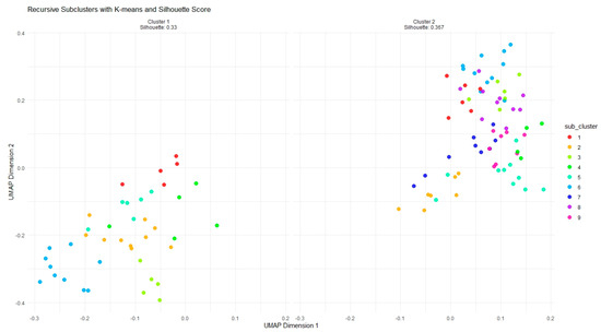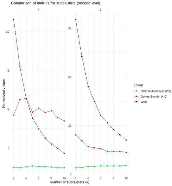 The optimal number of clusters (k*) was determined using multiple validation metrics, selected for their complementary strengths in assessing clustering quality from different perspectives. Specifically, the Within-Cluster Sum of Squares (WSS) was used to measure cluster compactness and to support the “elbow method” in identifying the optimal number of clusters. The Davies–Bouldin Index (DBI) provided a combined evaluation of intra-cluster similarity and inter-cluster separation, where lower values indicate better defined clusters. The Calinski–Harabasz Index (CHI) quantified the ratio of between-cluster dispersion to within-cluster dispersion, with higher values suggesting more distinct clustering structures. In addition, silhouette scores were applied as an intuitive measure of how well each data point fits within its assigned cluster, further supporting the interpretability of the results. The combined use of these metrics enabled a balanced and robust validation of the clustering outcomes in regard to both first-level and second-level recursive clustering.