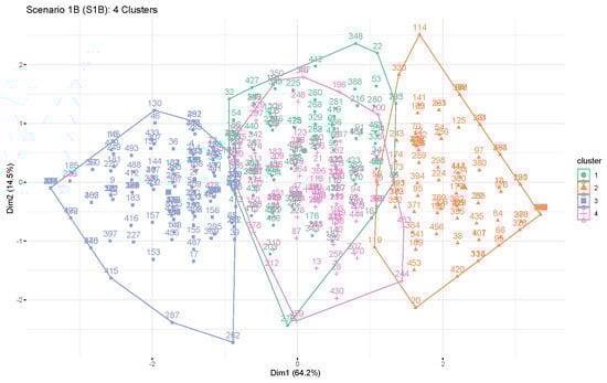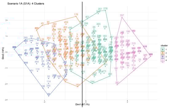| Value | Cluster 1 n = 78 (15.8%) | Cluster 2 n = 84 (17.0%) | Cluster 3 n = 166 (33.7%) | Cluster 4 n = 165 (33.5%) | F-Value | Significance |