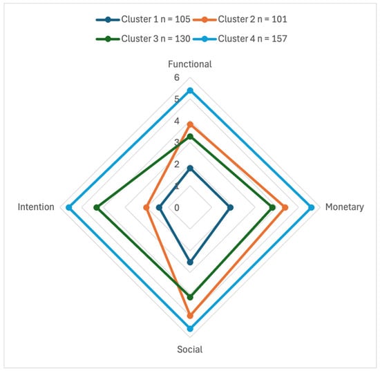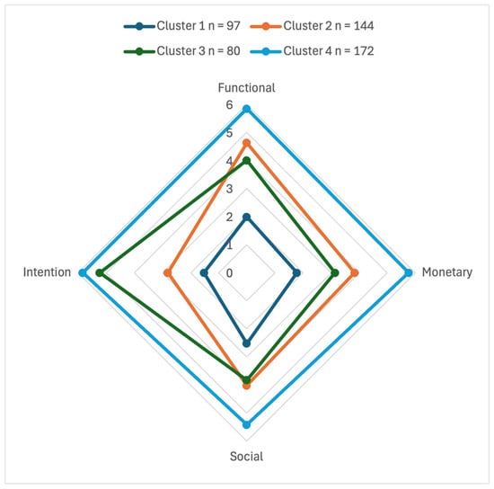 | Value | Cluster 1 n = 75 (15.2%) | Cluster 2 n = 125 (25.4%) | Cluster 3 n = 151 (30.6%) | Cluster 4 n = 142 (28.8%) | F-Value | Significance |