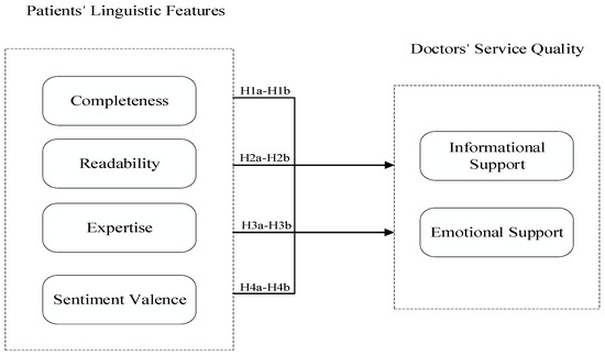 In summary, based on signal theory, this study analyzes and tests the impact of the linguistic features of patients’ self-disclosure on doctors’ service quality. The overall research model is shown in Figure 1.