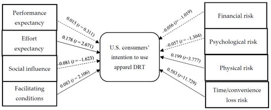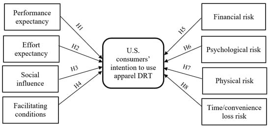Recent studies continue to underscore the importance of financial risk in consumer decision-making, particularly in the adoption of new digital technologies. Gupta and Arora [73] found that perceived financial risk significantly reduces consumers’ willingness to adopt mobile banking services, a finding that parallels the risks associated with DRT. Similarly, Tandon [63] emphasized that addressing financial risk is essential for encouraging the adoption of online services, including digital retail platforms. Given these considerations, financial risk is likely to play a significant role in shaping U.S. consumers’ intentions to use apparel DRTs. Therefore, the following hypothesis is proposed.