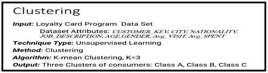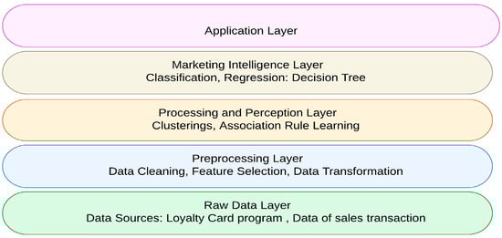 In our previous work [17], we proposed a multi-layered comprehensive framework to identify trends in consumer behavior using multiple layers of processing, including clustering, classification, and association rule learning. The aim was to help retailers understand customer behavior by utilizing the power of big data analysis and techniques. The philosophy behind building a consumer behavior analysis framework as a system of layers is to provide a standardized and consistent set of tools and methods for analyzing consumer behavior from different data sources. Figure 2 shows the framework as a layered system and the specific technique used in each layer. The bottom layer, Layer 1 (Raw Data Layer): in this layer, we used two data sources, the loyalty program repository and the data of sales transactions. Layer 2 (Data Preprocessing Layer): where we ensure that the data are cleaned and normalized, and any missing or incorrect data are removed. Layer 3 (Processing and Perception Layer): this is the backbone of the framework where the technical part is applied. In this layer, we implemented two machine learning techniques: an unsupervised data clustering technique using a K-means algorithm, and association rule learning using an FP-Growth algorithm. Layer 4 (Marketing Intelligence layer): a post-processing stage that supports the understanding of all results and produces more valuable findings. Here, we used a THAPE: Tunable Hybrid Associative Predictive Engine, which is a novel approach for enhancing the interpretability in association rule learning for retail [36]. Layer 5 (Application Layer): the last layer, where the results and recommendations are applied. For more details on the framework’s layers and the THAPE approach refer to [17,36].