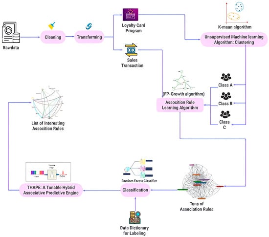 - Alawadh, M.; Barnawi, A. THAPE: A Tunable Hybrid Associative Predictive Engine Approach for Enhancing Rule Interpretability in Association Rule Learning for the Retail Sector. Comput. Mater. Contin. 2024, 79, 4995–5015. [Google Scholar] [CrossRef]