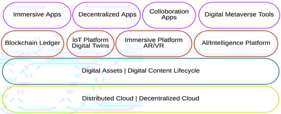 The term Metaverse has been interpreted and used in diverse ways. In 2004, Ref. [1] described it as combining an online and real-world environment where users can engage and socialize with others, conduct business, and enjoy themselves, utilizing the real world as a metaphor. In 2013, Ref. [2] defined it as a computer-generated universe beyond the real world, a fully immersive 3D digital environment that represents the entirety of shared online space across all representational dimensions. Ref. [2] conceptualized the term ‘Metaverse’ as a combination of the prefix ‘meta’ (meaning ‘beyond’) and the suffix ‘verse’ (meaning ‘universe’). Currently, the rapid development of technology in the fourth Industrial Revolution primarily supports Metaverse development, industries, and societal environments and processes due to the expansion of novel technologies like blockchain, artificial intelligence (AI), augmented reality (AR), virtual reality (VR), and enhanced mobile networks [3,4,5].