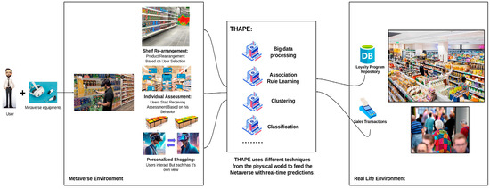 Our proposed architecture: the THAPE as an enabler for personalized shopping in the Metaverse that contributes to enhancing the personalized shopping experience within virtual supermarkets, serving as a key enabler in the Metaverse environment. Acting as a crucial feeding engine, the THAPE bridges the gap between the physical world and the Metaverse by providing real-time predictions and valuable insights. This innovative engine integrates various AI techniques, including big data analysis, association rule learning, clustering, and classification, to drive its predictive capabilities and optimize the customization of user experiences.