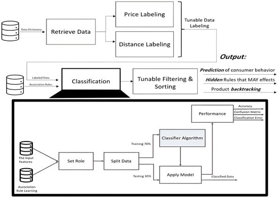In [17], we proposed a comprehensive machine learning-enabled framework for analyzing trends in consumer behavior, gaining insight into the data, and enabling data-driven decision-making. Towards building the framework, in an iterative Spiral model, we analyzed business needs and identified demands and performance indicators with the business owner of the third strongest retailer in the Arab world [53,54]. The framework presented in the Introduction Section shows the techniques used in each layer as a case study of the original framework, utilizing a real dataset retrieved from the business owner, which includes three months of sales transaction records for more than 30,000 customers. Figure 3 summarizes the detailed steps we have selected from the multi-layered framework to predict consumer behavior based on association rule learning. Below is what we have carried out and the output at each stage: