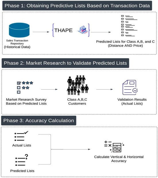 The validation analysis of our framework, based on real-world consumer responses, yielded promising accuracy rates across various association rules. Notably, it highlighted significant vertical and horizontal accuracy in Class C, making it the most predictable consumer class. The underlying reasons for this are discussed in detail in the Results and Analysis Section. Moreover, vertical accuracy outperformed horizontal accuracy. In association rule learning, the left-hand side (LHS) of a rule is particularly important. In our case, vertical accuracy was more significant, as it determined the LHS of the rule. Regarding distance- and price-based associations, the accuracy results indicated better performance in distance-based association predictions, which is especially relevant for product bundling.