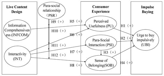PSI is an illusionary friendship or intimate relationship between viewers and remote media personalities [38,39]. Essentially, PSI is a one-way, asymmetrical, non-reciprocal interaction controlled by media personalities [39,40]. With the emergence of social media, allowing consumers to interact with media personalities at unprecedented frequencies and intensities, PSI has been used to understand interactions within online virtual communities [41], including YouTube [42], relationships between internet celebrities and consumers [43], and consumer interactions on social e-commerce platforms [44]. When individuals engage in PSI, they develop social expectations, crucial in forming impulse buying behavior [45]. Chen et al. [46] showed how social presence influences consumer identification, further shaping purchase decisions in livestreaming scenarios, providing empirical evidence for PSI’s role in impulse buying.