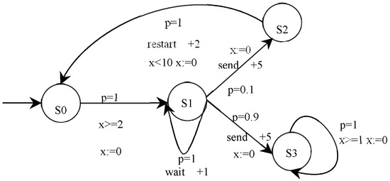Figure 2 shows a toy P2TA example of an e-commerce smart contract for communication between a buyer and a seller. The contract has four states: S0 is the initial state, S1 denotes the buyer trying to send a message to the seller, S2 means sending fails, and S3 denotes sending success. In this P2TA, from initial state S0, the buyer starts to try and send the message to the seller with gas 3; then, a nondeterministic choice happens between (a) waiting a step with gas 1 because the channel is unready and (b) sending the message with gas 5; if the latter occurs, it sends successfully with a probability of 0.9 and stops with gas 1. If it is the former, the send fails with a probability of 0.1 and restarts with gas 2. A single clock x measures the time between each event. As a result of the function execution, an event is triggered, and the state of the e-commerce smart contract changes, such as (S1, send, g [0, 1], h = 5, p = 0.1, S2), which means that the e-commerce smart contract holds on state S1 for less than 1 time unit and jumps from state S1 to state S2 by executing the action “send” with a probability of p = 0.1 and a gas consumption +5.