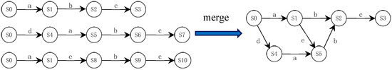The general passive learning process is actually a process of state merging, which aims to reduce the size of an initial automaton. The key is to determine what type of states should be merged and how to balance the size and accuracy of the learned model. Undoubtedly, as the length of the merged sequence increases, the error of the learned model will also increase. The K-Tail [53] algorithm considers that a state is defined by its possible future behavior. Thus, for a given history (i.e., string prefix), the current state reached by the history is determined by its possible future. Two or more strings can share a common prefix, which are separated from each other and provide multiple futures for a single history. The “k-future” is defined as the next k actions, where k is an important parameter for merging. If two different states have the same “k-future”, they belong to an equivalence class and should be merged. As shown in Figure 4, merging two equivalent states from an equivalence class consists of accumulating their outgoing and incoming transitions and deleting the others. The initial automaton may have multiple valid mergers, and randomly merging states will lead to an accuracy decrease in the final learned model. Evidence-driven state merging (EDSM) [47] explicitly emphasizes that the choice of the first merged states has an important impact on the learned model. It uses heuristics to score state merging and prioritizes the highest score. Coste [56] regards state merging as a graph coloring problem. Each state in the augmented prefix tree acceptor (APTA) will be mapped to a state in the corresponding targeted determining finite automaton (DFA). If different colors are assigned to each state in the APTA, it will be mapped to one of these colors. EDSM may produce an incompatible color merger, i.e., the wrong model was learned.