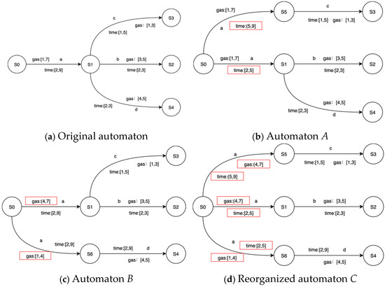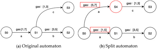 The purpose of splitting is to obtain more sensitive and detailed transitions in the learned model P2TA. PL4ESC extends the time guards’ splitting to simultaneously split the time and price guards. In the learning process, the specific gas consumed at each transition should be modeled. The condition of splitting depends on whether there is a more refined guard for a certain transition. Let us consider an edge e and guard [min, max] (here, guard may be the time or price) to be on the state s1 to s2, and let s2 lead to different parts of the automaton: part 1 and part 2. Given an input sequence, if a timed transition e from s1 to s2 is always going to part 1 with a delay in [min, v], while others lead to part 2 with a delay in [v + 1, max], v [min, max], then the transition e can be split. A new state, s3, reached from s1, is created, such that s2 leads to part 1 and s3 to part 2. Both transitions from s are labeled by the same action but are associated with different guards [min, v] and [v + 1, max]. We take the splitting transition with the gas interval as an example, which is shown in Figure 5.