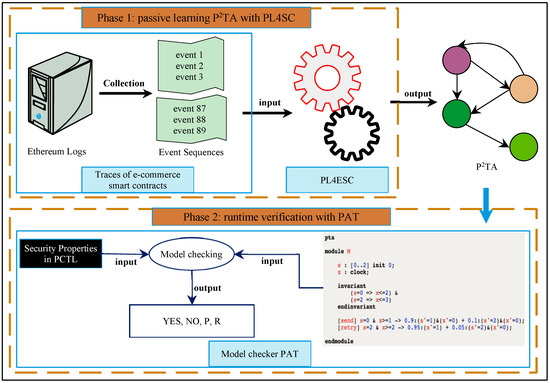 We take Ethereum Solidity as the concrete e-commerce smart contract, which is the first Turing-complete programming language of smart contracts. We take quantitative security specification [25] in PCTL (probabilistic computation tree logic) as the verification property. We argue that model learning can be used to model runtime e-commerce smart contracts. To efficiently obtain a runtime model closer to the real situation of an e-commerce smart contract, in this paper, we propose a novel model learning method without any prior knowledge. It is a passive learning method that can learn P2TA (priced probabilistic timed automaton) as the runtime model for an e-commerce smart contract (PL4ESC) from historical events (i.e., traces). Compared to state-of-the-art passive learning methods, such as TAG [26] and RTI+ [27], PL4ESC is the most effective, as it can simultaneously model temporal and gas consumer behaviors in an e-commerce smart contract at runtime. The gas is modeled as a price on each edge of the P2TA. In addition to this, to further improve the effectiveness of PL4ESC, we designed a Genetic algorithm to merge state sequences and devise automaton reorganizing to simultaneously split time and gas behaviors. This will reduce the possibility of generating false mergers and improve the accuracy of the learned model, P2TA. Then, we integrated PL4ESC into the open-source PAT (Process Analysis Toolkit) [28,29] to implement the automated security verification of e-commerce smart contracts at runtime. The specific contributions of this paper are as follows: