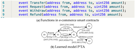 There is also another way to analyze the runtime behavior of e-commerce smart contracts, which is based on the traces of e-commerce smart contracts at runtime. We argue that this can be an alternative solution for runtime verification of e-commerce smart contracts. This is to say, rather than verifying smart contracts by monitoring, this aims to extract a runtime model from the traces of e-commerce smart contracts and verify the model automatically. The key to verifying e-commerce smart contracts by this method is solving how to model e-commerce smart contracts from the traces. With manual modeling, it is difficult to take into account all secure aspects of e-commerce smart contracts [13,14]. Moreover, the model’s quality completely depends on the modeler’s knowledge and understanding of e-commerce smart contracts, and this will inevitably lead to uneven model verification results. Recently, model learning [15,16,17] has developed rapidly; it automatically learns a model from the samples of observations or executions of a system. Such a model can be used for verification and analysis of an e-commerce smart contract at runtime. Model learning has been widely used in many fields, including analyzing TCP or SSH implementations [18,19], modeling automatic driving behaviors [20], and automatic generation of software behavioral models [21]. In [22], Dong et al. extracted probabilistic automata from observations to explain recurrent neural networks. The core of model learning is the learning algorithms that learn a model from a runtime system. In fact, many learning algorithms learn the system as a deterministic finite automaton (DFA) [23] or variants of DFA [24]. However, current learning algorithms have shortcomings in terms of the accuracy and expressiveness of the learned model, which are still not expressive enough for e-commerce smart contracts at runtime. Moreover, the effectiveness of the learning process, especially state merging, should be enhanced.