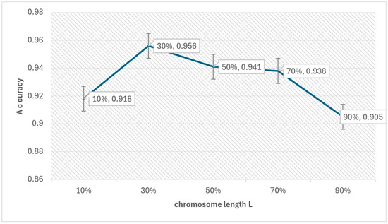We first show the impact of the GA parameters on the PL4ESC method. PL4ESC requires setting the initial parameters of the Genetic algorithm, including k in “k-future”, population P, iterations I, crossover rate CR, mutation rate MR, elite rate ER, and length of chromosome L. The most important parameters we need to consider are k and L. All other parameters can be selected with appropriate values based on experience. The choice of k has a direct impact on which states will be merged, but we will not study the specific impact of k on the algorithm in this paper. Much work has been conducted to demonstrate that making k = 2 will be the best choice. What we care about is how parameter L affects the accuracy of PL4ESC. The longer the chromosome, the more color-compatible mergers it may contain, but it also increases the probability of incorrect mergers. Obviously, it is the key parameter that affects the accuracy of the learned model. We evaluated its specific impact via a dataset containing 1000 traces and an alphabet size of 6. These data are divided into two parts, of which 70% are used to learn the runtime model and 30% are used for testing. The other parameters in the learning process are fixed as P = 100, I = 100, CR = 0.7, MR = 0.02, and ER = 0.4. We then evaluated the accuracy of PL4ESC when the length of L is 10%, 30%, 50%, 70%, and 90% of all valid mergers in the reduced table, respectively. The results are shown in Figure 12.