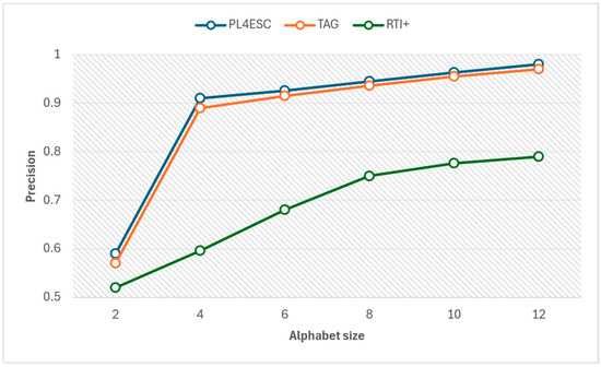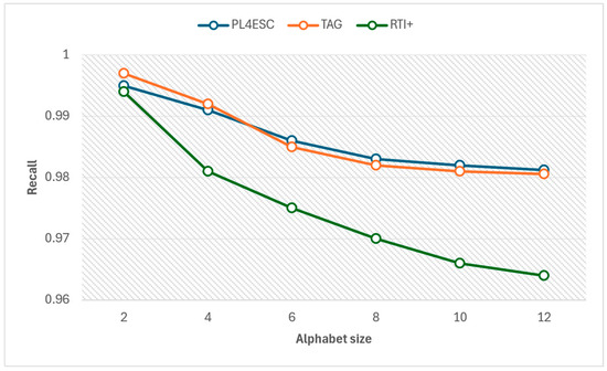 An ideal runtime model P2TA of an e-commerce smart contract should accept a sufficient number of positive samples and reject negative samples. To avoid the negative impact of experiment data imbalance on accuracy, we compared the precision and recall of three methods for different alphabet sizes at the same number of 1000 traces, as shown in Figure 15 and Figure 16. The specific experiment results are shown in Table 5 and Table 6. The larger the alphabet, the more optional operations are represented by the passive learning methods. When the input dataset contains a large variety of events, it helps to learn models with higher precision. The passive learning methods can gain more knowledge about e-commerce smart contracts by learning from more alphabets. Therefore, precision increases as the size of the alphabet increases, and recall decreases as the size of the alphabet increases. The TAG method has a higher recall than PL4ESC until the alphabet size is 6. This is because the model (P2TA) learned by PL4ESC is more complex than the timed automaton (TA), which makes it more difficult for PL4ESC to identify runtime traces. However, PL4ESC always maintains the best precision, as it adopts Genetic algorithm-based state merging and automaton reorganizing.