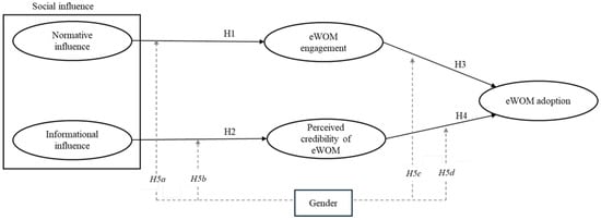 These theoretical considerations are directly linked to the conceptual model proposed in this study, which integrates normative and informational influence as antecedents of eWOM engagement and perceived credibility, leading to adoption. We posit that gender may moderate these paths by influencing the degree to which men and women engage with eWOM behaviors.