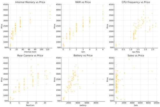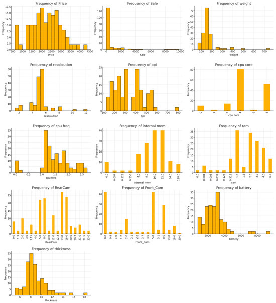 The investigated dataset can be found on the Kaggle platform and consists of 161 rows and 14 columns (https://www.kaggle.com/datasets/mohannapd/mobile-price-prediction) (accessed on 20 January 2025): Product_id—unique identifier for each mobile phone model; price—the market price of the mobile phone; sale—the number of units sold; weight—the weight of the mobile phone (in grams); resolution—screen resolution (in inches); PPI—pixels per inch (display sharpness metric); CPU core—number of CPU cores; CPU freq—CPU clock speed in GHz; internal mem—internal storage in GB; RAM—random access memory (RAM) in GB; RearCam—rear camera resolution in megapixels; Front_Cam—front (selfie) camera resolution in megapixels; battery—battery capacity in mAh; thickness—thickness of the phone in mm. A sample of the dataset is shown in Table 2, while Table 3 provides a description of the columns. Summary statistics for the dataset are presented in Table 4.