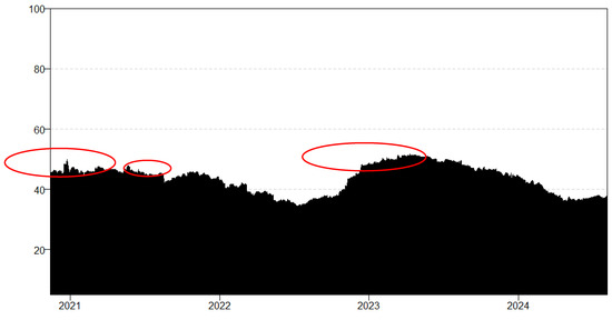 The network plot for the 2021–2024 period provides a visually intuitive representation of pairwise directional connectedness, revealing the underlying architecture of shock transmission across asset classes. Gold (XAU/USD) and Tether Gold (XAUT) emerge as dominant net transmitters, represented by large blue nodes that signify their centrality and influence within the shock propagation network. Their role becomes especially prominent during episodes of elevated inflation and macroeconomic stress, reinforcing their status as key volatility drivers in turbulent environments. This finding aligns with the study by Lamine et al. [27], which similarly identified gold-backed assets as core transmitters vis-à-vis Bitcoin.