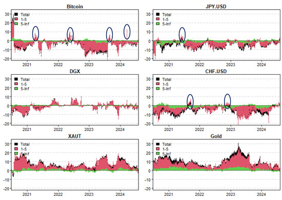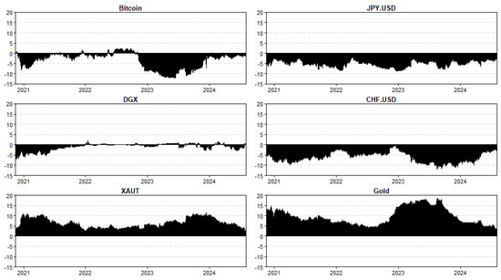 Table 2 presents the results of a dynamic connectedness analysis and sheds light on how much each asset’s forecast error variance is driven by its own shocks vs. external shocks from other assets. For intrinsic variance contributions, Bitcoin, DGX, and gold have relatively high self-dependence, meaning that a large portion of their forecast error variance is explicated by their own shocks. Wang et al. [20] also projected similar shock-absorbing properties for bitcoins and gold. Precisely, Bitcoin’s own variance contribution is 88.01% and DGX’s is 93.96%, while XAUT, JPY/USD, CHF/USD, and gold exhibit lower self-contributions, with XAUT showing 43.39%, JPY/USD 57.88%, CHF/USD 56.57%, and gold 42.46%. This implies that these assets are more influenced by external shocks compared to Bitcoin and DGX.