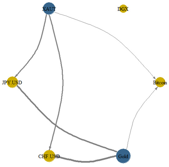 The network plot (see Figure 3) shows that gold and XAUT (in blue) act as strong net transmitters, sending shocks primarily toward Bitcoin, JPY/USD, and CHF/USD (in yellow), which behave as net receivers. The thick directional arrows confirm that gold-backed assets dominate shock propagation, while cryptocurrencies and fiat currencies mainly absorb volatility during the analyzed period.