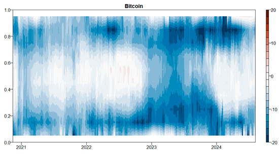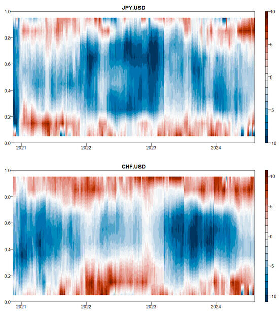 Correspondingly, JPY/USD and CHF/USD tend to behave as receivers of shocks, with smaller fluctuations compared to Bitcoin. They sometimes transmit shocks during precise periods, but their overall behavior suggests that they are more reactive to global market dynamics rather than being consistent drivers of volatility. This alternating pattern reinforces the idea that although these currency pairs are generally more stable than volatile assets like Bitcoin, they can still impact the broader market during certain episodes. Short-term dynamics play a key role in their connectedness, but their overall fluctuations are moderate compared to those of Bitcoin.