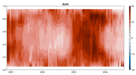 The total connectedness amid different quantiles from 2021 to 2024 in Figure 4, highlights how interdependence among assets varies across market conditions. In the median quantile, representing more stable market conditions, total connectedness remains moderate but displays notable spikes during 2021 and the first half of 2023. As market volatility intensifies in the extreme quantiles, total connectedness reaches its highest levels, but this occurs symmetrically. This indicates that under extreme market conditions, gold, fiat currencies, cryptocurrencies, and gold-backed assets are highly interconnected, responding collectively to economic shocks. The increased interconnectedness during crises emphasizes the systemic risks and widespread market reactions to significant financial disruptions. The observed time-varying correlation structure is in line with the modern portfolio theory explanation on optimizing portfolio construction in changing environments, where asset co-movements exhibit alteration in response to macroeconomic shocks. Several existing studies have also exhibited similar outcomes while exploring market interconnectedness amid different quantiles considering a wide array of financial assets [27,28]. These results imply that asset class behavior becomes more synchronized as tail risks materialize, thereby reducing diversification benefits when they are most needed. This reinforces the necessity of stress-tested hedging strategies that account for non-linear contagion patterns across quantiles.
