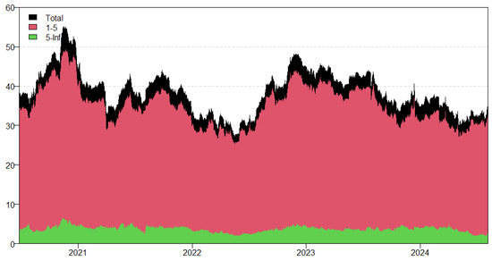 The total connectedness through frequencies, as depicted in the Figure 6, demonstrates the overall level of interdependence among assets over time. The mainstream of this connectedness is driven by short-term interactions, represented by the red area, which dominates the graph from 2021 to 2024. Peaks in total connectedness, particularly in late 2021 and mid-2023, suggest periods of heightened market stress or volatility when asset prices become more correlated over short periods. Also, the long-term connectedness, shown in green, remains consistently low throughout the period, indicating that market dependencies are primarily short-term in nature. This dominance of short-term spillovers supports Hypothesis 1, confirming that extreme shocks result in immediate, though often temporary, synchronization across asset classes. The observed pattern also aligns with network theory, emphasizing the role of rapidly shifting linkages during crisis periods rather than stable long-term integration.