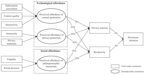 As noted earlier, user disclosure is crucial to the continuous development of generative AI. Previous studies focused on user disclosure intention in the traditional contexts, such as online healthcare [5,6], social networking [7,8], and mobile applications [9,10]. Various factors, such as trust and privacy concern, are found to affect user disclosure [5,8,9]. However, these studies seldom examined user disclosure in generative AI, which represents an emerging technology. In other words, the mechanism underlying generative AI user disclosure remains a question. This research tries to fill the gap. The purpose of this research is to examine generative AI user disclosure intention from a perceived affordance perspective. Compared with traditional information technology, generative AI has more powerful features, such as intelligence emergence and anthropomorphic interaction experience, which may improve users’ perceived affordance and affect their behavioral decision. From a technological–social perspective [11], we propose that perceived affordance includes perceived affordance of content generation, privacy protection, and anthropomorphic interaction. Among them, the former two belong to technological affordance, whereas the latter one is social affordance. Perceived affordance of content generation contains information association, content quality, and interactivity. Perceived affordance of privacy protection contains anonymity and a privacy statement. Perceived affordance of anthropomorphic interaction contains empathy and social presence. We include privacy concern and reciprocity as the mediators between perceived affordance and disclosure intention. Partial least square structural equation modeling (PLS-SEM) and fuzzy-set qualitative comparative analysis (fsQCA) were used to analyze the data. The results will uncover the effect mechanism of perceived affordance on generative AI user disclosure. They may also provide insights for generative AI platforms to promote user disclosure intention and ensure the sustainable development of platforms.