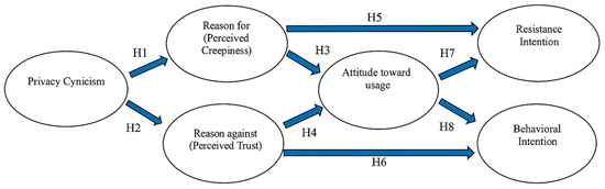 Privacy cynicism can be defined as a belief or attitude. It is characterized by frustration, hopelessness, and disillusionment regarding privacy protection efforts, particularly in the context of data collection practices by powerful institutions like tech companies [52] (p. 149). This belief arises from feelings of powerlessness and resignation toward data handling, where individuals perceive privacy protection as futile due to the inevitability of surveillance and lack of control over their personal information [50] (p. 5). According to Lutz et al. [51], cynicism relates to users’ feelings of uncertainty and helplessness when interacting with new technologies such as chatbots and SVAs. As users engage with these technologies, they often feel a loss of control over their personal data, leading to discomfort or creepiness. Creepiness is an emotional response of consumers to the privacy issue that leads to resistance to AI agents. Rajaobelina et al. [53] showed that perceived creepiness leads to resistance intention toward smart home devices. Yip et al. [54] found that a lack of control is a key factor contributing to creepiness in children. Hoffmann et al. [50] highlighted that consumers tend to adopt a cynical attitude when they experience such a lack of control. In the context of online shopping with SVAs, consumers may feel uneasy about sharing their personal and financial data, which could lead to privacy cynicism and, ultimately, positively contribute to perceived creepiness, which is a reason against SVA usage for shopping purposes. Moreover, it is expected that privacy cynicism is an inhibitor to perceived trust, which is a reason for SVA usage for shopping purposes. Therefore, we posit the following hypotheses: