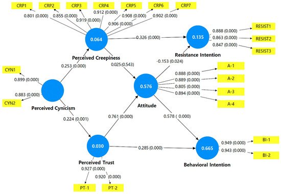 Perceived cynicism positively affects perceived creepiness (β = 0.253, p = 0.000); H1 is accepted. The effect of perceived cynicism on perceived trust is positive (β = 0.224, p = 0.001); H2 is rejected. The influence of perceived creepiness on attitude toward SVA usage is positive but insignificant (β = 0.25, p = 0.544); H3 is rejected. Perceived trust positively affects the attitude toward SVA usage (β = 0.761, p = 0.000); H4 is accepted. The results demonstrated that the influence of perceived creepiness on resistance intention is positive (β = 0.326, p = 0.000); H5 is accepted. The influence of perceived trust on behavioral intention is positive (β = 0.285, p = 0.000); H6 is accepted. The effect of attitude toward SVA usage on resistance intention is negative (β = −0.153, p = 0.024); H7 is supported. The effect of attitude toward SVA usage on behavioral intention is negative (β = 0.578, p = 0.000); H8 is accepted.