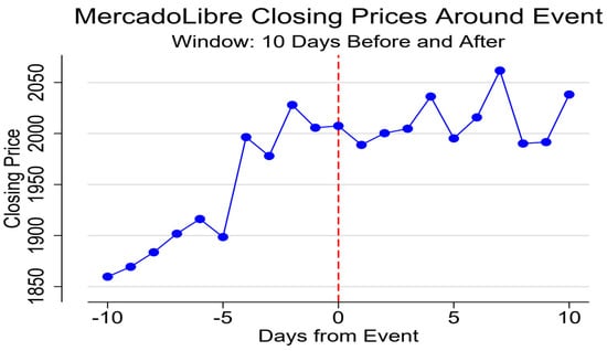 Mercado Libre closing price around the event with x = 0 indicating the event date. Note: The red line refers to the event date and the blue line represents the movement of stock prices.