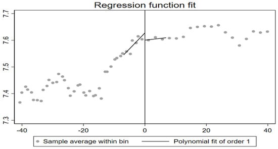Because this study is concerned with isolating discontinuous changes on the cutoff date, we first assessed the appropriate order of the polynomial that would provide the best fit for the analysis. We tested the values for different polynomial orders; the coefficients, standard errors, p-values, and bandwidth-related information are presented in Table 2. It is clear that the first-order polynomial is highly significant, and because higher-level polynomials are likely to induce excessive curvature, they may potentially indicate more noise. The bandwidth is 6 to the left of the cutoff date and 7 to the right of the cutoff date, and we consider this to be optimal as it involves stock price movements and a period that is too large may introduce bias.