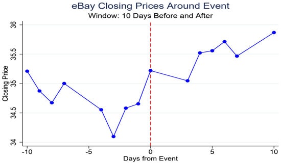 eBay closing prices around the event with x = 0 representing the event date of 11 October 2019. Note: The red line refers to the event date and the blue line represents the movement of stock prices.