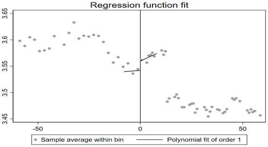 The regression discontinuity estimates for the first-to-fourth-order polynomials are presented in Table 6. The first-order polynomial provided the highest coefficient and was also highly significant (p = 0.001), indicating a reliable discontinuity at the cutoff point. The higher-order polynomial estimates appear to be smaller by comparison, besides using wider bandwidths, which increases the risk of bias as it includes observations away from the cutoff point.