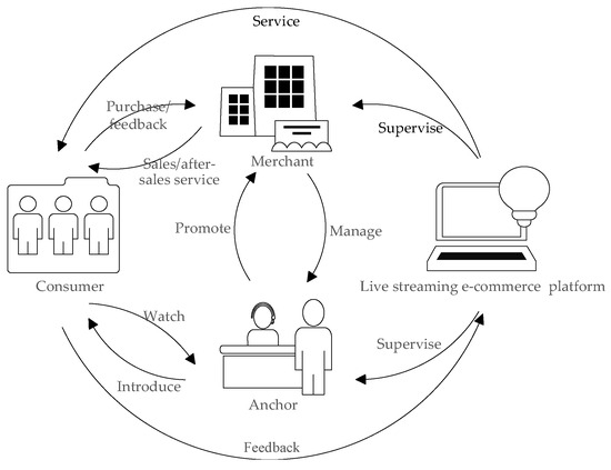 In the process of live streaming transactions, merchants provide commodities and promotional materials to live streaming marketers, who carry out sales promotion on the live streaming e-commerce platform, while the live streaming e-commerce platform connects merchants, anchors, and consumers to facilitate transactions and, at the same time, supervises the merchants and live streaming marketers on the platform. Consumers bear the purchase decision, confirm the receipt of goods, evaluate feedback and other content, and finally jointly build a complete live e-commerce transaction ecosystem. According to the above realistic scenario, the live e-commerce transaction business model is established, as shown in Figure 1.