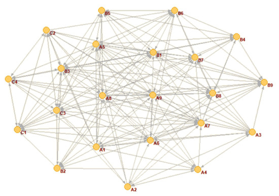 Social network analysis (SNA) is a method to study social phenomena such as interpersonal relationships, organizational structures, and information flow. By using graph theory and network analysis techniques, SNA can reveal the connection patterns and structural characteristics among individuals, which can help decision makers understand issues related to social organization structure, information transmission, and influence mechanisms [41]. On the basis of the adjacency matrix, Pajek is used to build a network diagram with various influencing factors as nodes, explore the relationship between the risk factors of live streaming e-commerce transactions through network characteristics, and identify key risk factors. The specific steps are as follows [41]: