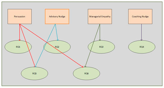 The following figure is organizing these concepts, helping to understand the logic behind the formulation of the questions. The choice of these thematic focuses is not random, because they reflect the gaps in existing literature and the need to explore the ethical use of nudge in supervisor-employee relations. This logical structure is also visually represented in Figure 1, where the four theoretical axes—Persuasion, Advisory, Empathy, and Coaching Nudge—are each connected with one main research question (RQ1 to RQ4), while two additional questions (RQ5 and RQ6) emerge from the intersection of these axes, reflecting deeper relational dynamics between autonomy, trust, and ethical influence. The figure illustrates how the conceptual flow of the study moves from theory to applied inquiry, providing a clear justification for the formulation of the research model.