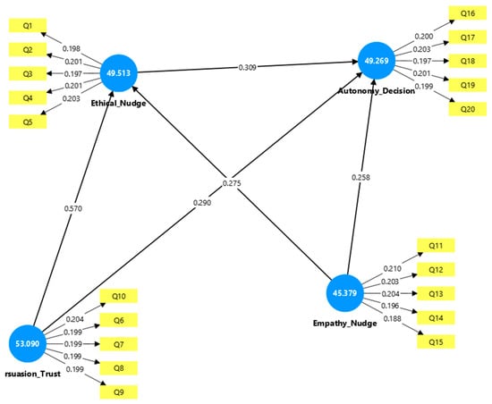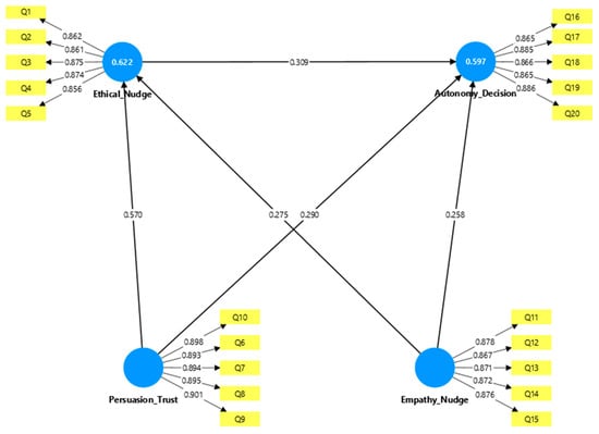 This section presents the research methodology applied to investigate the relationship between key dimensions of managerial nudging and HR professionals’ acceptance of influence in the workplace. A quantitative research design was used, aiming to explore how specific elements of nudging practices are related with the acceptance and ethical decision-making in working environment. In this study, we adopted a research question-driven approach rather than formulating strict hypotheses. This was chosen because the field is still in a stage of theory development, and exploratory analysis is more appropriate for capturing complex and context-dependent relationships. While formal hypotheses could be developed in future studies, here our goal was to explore the dynamics between persuasion, empathy, and ethical nudging with an open and theory-building logic.e the proposed relationships [49,50]. The study followed a cross-sectional logic and the data was collected by a structured questionnaire that was built especially for the research objectives. For the analysis, Partial Least Squares Structural Equation Modeling (PLS-SEM) was used, and the statistical processing was implemented using SmartPLS software (version 4.1.1.2).