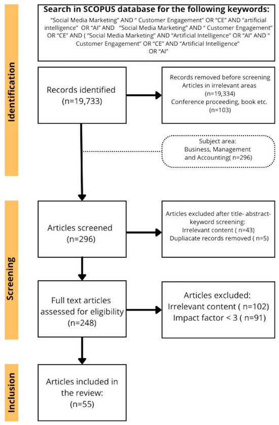 During the screening phase, we conducted a title–abstract–keyword review of these 296 articles narrowing our focus to studies examining the impact of AI on CE and SMM and excluding 43 irrelevant articles [41,43]. For example, we excluded Diwanji et al. [44] who analyzed understandings of the role of AI in programmatic advertising. At this stage we also excluded 5 duplicates. Finally, this step yielded 248 articles qualified for full-text review [45,46].