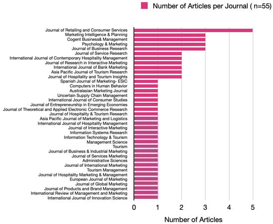 Our sample of articles came from 37 journals including Journal of Retailing and Consumer Services (5 articles), Marketing Intelligence and Planning (3), Cogent Business and Management (3), Psychology and Marketing (3), Journal of Business Research (3), Journal of Service Research (2) and International Journal of Contemporary Hospitality Management (2), Journal of Research in Interactive Marketing (2), International Journal of Bank Marketing (2), Asia Pacific Journal of Tourism Research (2), Journal of Hospitality and Tourism Insights (2), and others (Figure 2).