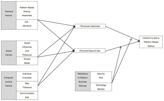 Platform-based startup awareness (PBSA) plays a critical role in digital entrepreneurship, influencing an individual’s ability to adapt to complex markets by applying their competencies [26]. Entrepreneurs who thoroughly understand platform features are more likely to recognize the value of resource integration, opportunity recognition, and operational efficiency offered by the platform. This recognition increases perceived usefulness (PU) regarding platform entrepreneurship [27]. In other words, PBSA can generate new business opportunities and drive innovation, significantly enhancing the perceived utility of platform-based startups. Moreover, a positive perception of entrepreneurship can reduce psychological resistance to platform startup activities and motivate individuals to utilize the vast array of technologies and tools embedded within the platform. Such motivation often translates into pride in sustaining or advancing one’s economic activity. Notably, platforms provide a range of technical tools that are particularly useful during the planning and launch stages of startup.