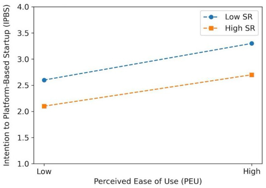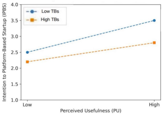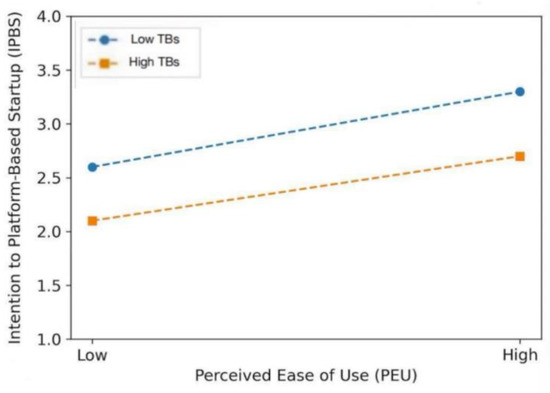 TBs arise when new technologies and innovative services are complicated for users to understand or apply, potentially hindering platform adoption and the efficiency of entrepreneurial activities [68]. In platform environments, confidence in IT skills promotes participation and improves operational strategies [69]. In contrast, the higher the technological barrier, the more difficulty entrepreneurs may face adapting to the platform, which can ultimately weaken their entrepreneurial intention [70]. The moderating effect of technology barriers draws upon the diffusion of innovation theory, which suggests that adoption depends not only on perceived benefits but also on perceived effort and system compatibility. High perceived technological barriers (e.g., complexity, lack of support) can diminish the impact of cognitive beliefs on intention by creating friction in the decision-making process. In entrepreneurial contexts, where users often lack technical assistance, these barriers may disproportionately deter novice users. Prior studies in digital entrepreneurship confirm that system complexity moderates the ease–intention relationship [71].