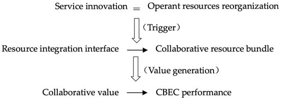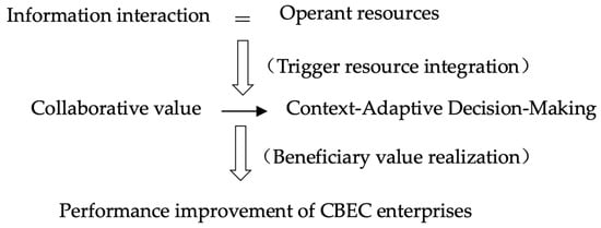 In terms of the interaction between PLSI and the performance of CBEC enterprises, firstly, the theoretical essence of service innovation is the strategic reorganization of Operant resources. The service-oriented value co-creation theory believes that economic value originates from the dynamic integration of Operant resources, which generates new value by acting on Operand resources. The essence of port logistics service innovation is the strategic reorganization of its Operant resources (such as digital capabilities, collaborative algorithms, process design knowledge, etc.) by port logistics service enterprises [16]. This reorganization activates the potential effectiveness of Operand resources (such as port facilities, transportation tools, etc.) through the reconstruction of the enterprise’s internal capabilities. Secondly, the value co-creation mechanism is embodied in resource integration. The service-oriented value co-creation theory requires that value creation must be realized through the resource integration of service providers and users [17]. The service innovation (Operant resource reorganization) of port logistics service enterprises provides a new resource integration interface for CBEC. CBEC injects its own resources (such as commodity flow and capital flow) into the interface, and is coupled with the Operant resources of port logistics service enterprises to form a collaborative resource bundle. The resource bundle generates indivisible collaborative value (such as shortening the logistics cycle, reducing the risk of cargo damage, etc.) through mutual adaptation. Thirdly, collaborative value is transformed into performance. The service-oriented value co-creation theory proposes that performance is the perception and realization of co-created value by beneficiaries [18]. As direct beneficiaries, CBEC enterprises have effectively improved their business performance under the causal chain of “Operant restructuring → resource integration → collaborative value → performance perception”, as shown in Figure 4.
