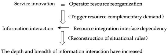 In terms of the interaction between PLSI and information interaction, firstly, the essence of service innovation is Operant resources reorganization. The service-oriented value co-creation theory puts forward that the essence of all economic exchanges is service exchange, and services are driven by Operant resources (knowledge, skills, systems, etc.). In essence, PLSI is the strategic reorganization of its Operant resources (such as data algorithm, process design ability, collaborative knowledge, etc.) by port logistics service enterprises. The reorganization process expands the resource integration boundary of the enterprise [19] and creates a new interface for information interaction. Secondly, the reorganization of Operant resources has spawned new demands for information interaction. “Resource complementarity principle” believes that high-order Operant resources (such as an intelligent scheduling algorithm) need to be coupled with complementary resources to release value [20]. The service innovation of port logistics service enterprises (such as a dynamic position system) requires real-time order flow data (Operant resources of CBEC) to calibrate the model, while CBEC needs to obtain visual information of the shipping schedule (Operant resources of port logistics service enterprises) to optimize inventory decisions. Therefore, the efficiency release of Operant resources after service innovation depends on “two-way information interaction”; otherwise, the resource integration interface will fail. Thirdly, service innovation reconstructs the situational rules of information interaction. The context dependence principle of the service-oriented value co-creation theory emphasizes that value co-creation is defined by a specific context [21]. A context change forces participants to adjust the information interaction mode, while PLSI reconstructs the context through three paths: (1) the complexity is increased, new variables are introduced into service innovation, and finer grained data needs to be exchanged; (2) the timeliness is compressed, and service innovation accelerates the process, forcing the frequency of information interaction to upgrade; and (3) risk redistribution and service innovation change the responsibility boundary and require information transparency improvement, as shown in Figure 5.