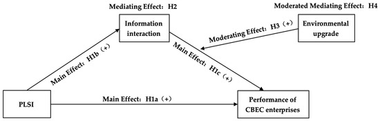 Therefore, based on the mediating effect of information interaction and the moderating effect of environmental upgrade, this study constructs a moderated mediation model of the impact of PLSI on the performance of CBEC enterprises, as shown in Figure 7: