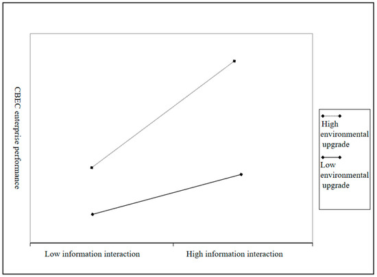 This study first standardized the variables of PLSI, information interaction, and environmental upgrade, and then multiplied the information interaction and environmental upgrade to obtain the interaction term of the two, to test the moderating effect. The results are shown in Table 16: After adding environmental upgrade into the model, the product term of information interaction and environmental upgrade has a significant predictive effect on the performance of CBEC enterprises (β = 0.139, t = 2.944, p < 0.01), indicating that environmental upgrade positively moderates the predictive relationship between information interaction and the performance of CBEC enterprises.