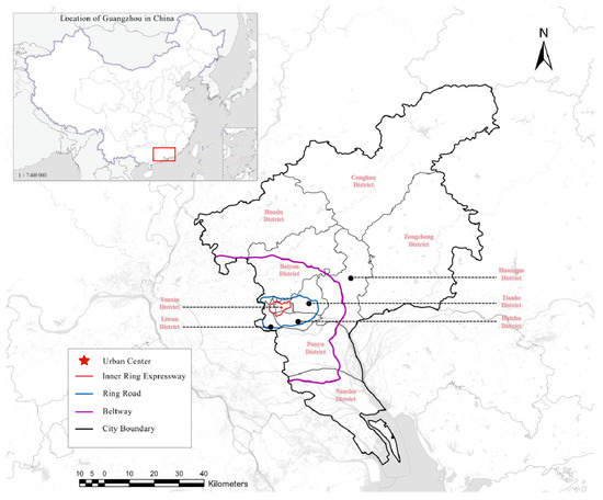 Guangzhou is an ideal location for studying e-commerce demand for several reasons. As a major metropolis in Southern China, it boasts a robust and diversified economy, and it covers approximately 7434 square kilometers. This area is organized into three circles: the Inner Ring Expressway, the Ring Road, and the Beltway. According to the Seventh National Census [30], Guangzhou had a resident population of 18.67 million. This makes it one of the most populous and economically significant cities in China, which in turn influences e-commerce demand patterns. Its strategic position in the Pearl River Delta—a hub of economic activity in China—also increases its importance. Guangzhou serves as a crucial node in both national and international trade networks, having excellent land, sea, and air connectivity, and it is well positioned near to Hong Kong and Macau (see Figure 1).