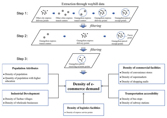 This study utilizes waybill data to estimate e-commerce demand, facilitating a comprehensive comparison of global and local regression models. Parcel delivery volumes, operationalizing as a proxy for e-commerce demand, were analyzed as the dependent variable to capture spatially granular consumption behaviors. Explanatory variables were systematically categorized into factors related to population attributes, industrial development, the density of commercial facilities, transportation convenience, and the density of logistics facilities. The detailed conceptual framework for these variables is shown in Figure 2.