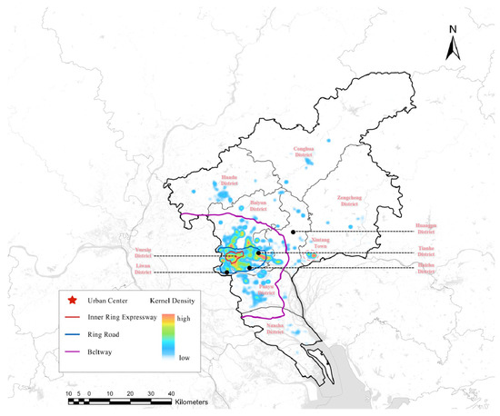 Kernel density estimation (KDE) is a widely used method for visualizing and analyzing spatial point distributions. They are applicable in various fields, including historical geography, crime analysis, public health, and transportation planning, among other topics within spatial humanities studies. Heatmaps use a gradient of warm and cool colors to illustrate the density distribution trends of point data, effectively minimizing overlap and highlighting areas of higher concentration. KDE is a classical spatial statistical method that generates heatmaps by applying a kernel function and attenuation effects to capture spatial point patterns, in accordance with Tobler’s First Law of Geography [33]. In this study, KDE was employed to identify spatial heterogeneities in e-commerce demand. The general form of the KDE model is as follows: